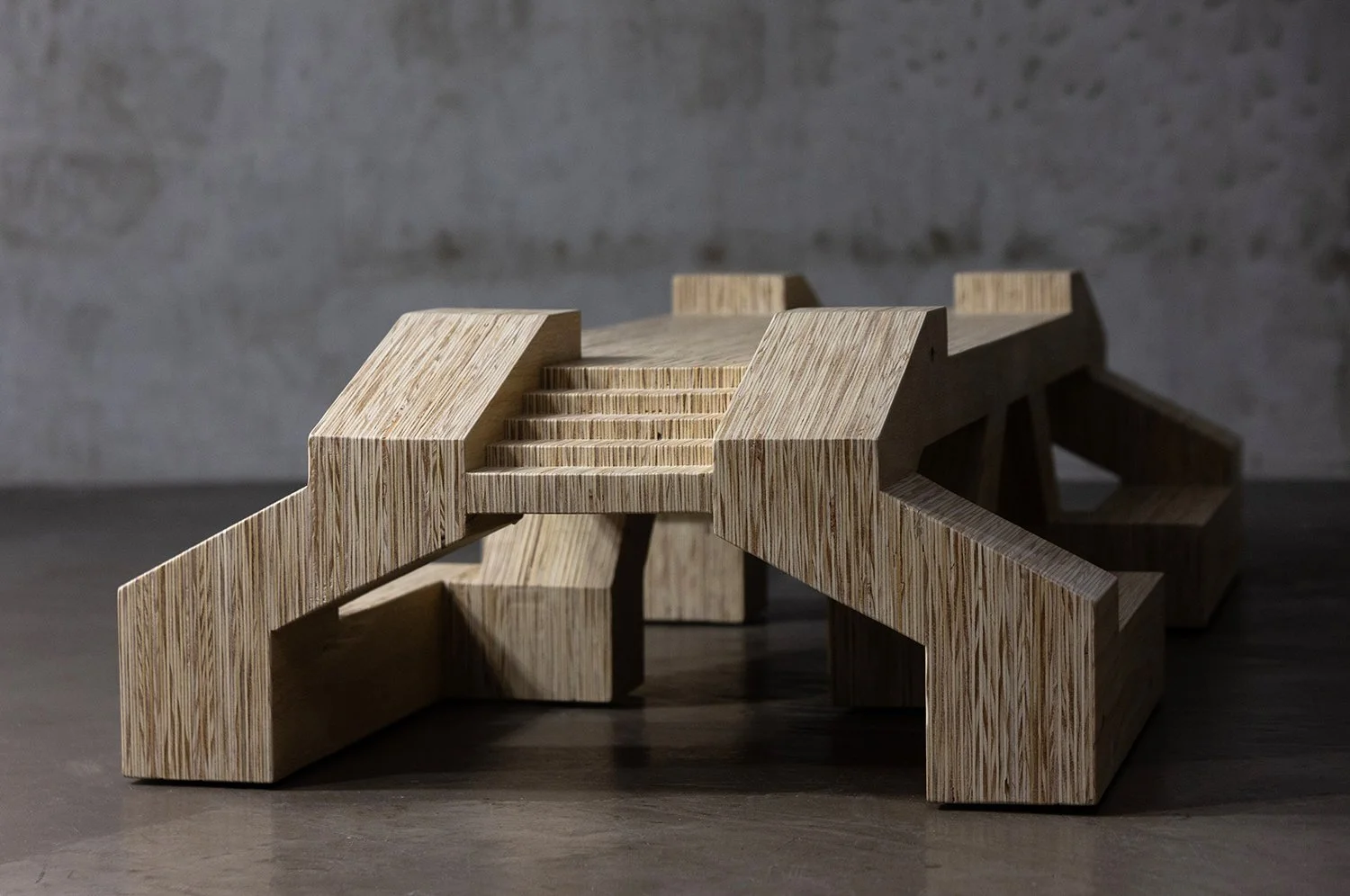 The collection includes two plywood works: a low table and a side table or stool, crafted in Las Ánimas’ studio. Modular and versatile, they can stand alone or be combined to shape different spatial arrangements.