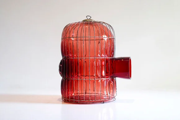 The objects are a result of the interaction of the hot fluid glass with the molds: the final pieces carrying the marks and history of both their former existences. The project questions the status of confinement versus refuge. A cage can be conceived as imprisonment or a shelter for comfort. The glass works subtly capture this essence of limitation, protection and custody in a very imaginative fashion.
