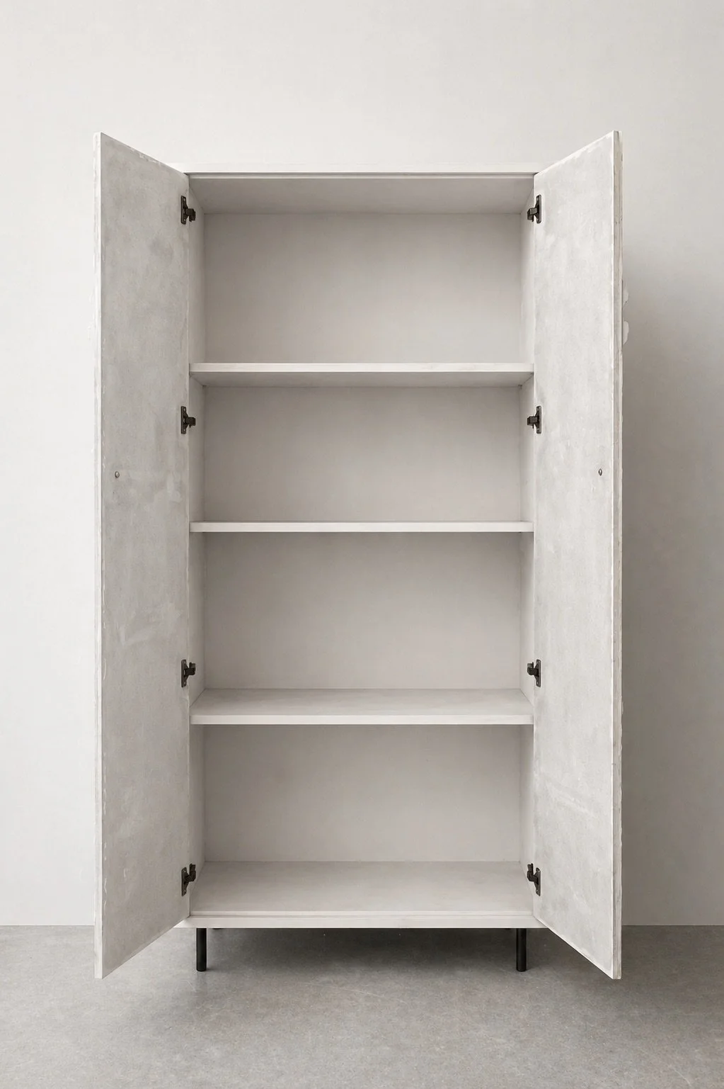 The Wilde Karde cabinet, crafted from solid concrete using a lightweight casting technique, demonstrates a high level of technical precision and craftsmanship. The corpus is cast in a single piece, creating a seamless and monolithic form that emphasizes its architectural presence. Across its surfaces, impressions of wild teasel (Dipsacus fullonum) are embedded as permanent reliefs. These botanical imprints lend the piece a tactile, organic texture, softening the material’s industrial character with a subtle reference to natural growth. The cabinet includes three concrete shelves and steel feet.